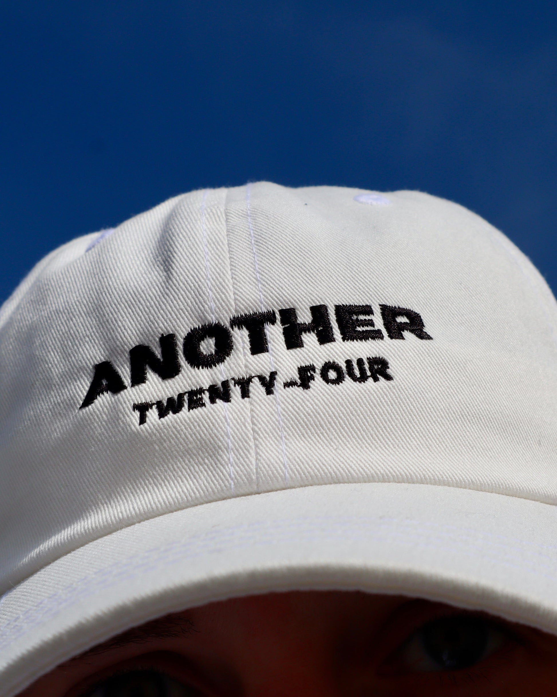 This design is a white baseball cap with ‘Another Twenty-Four’ embroidered in black on the center face of the cap <3